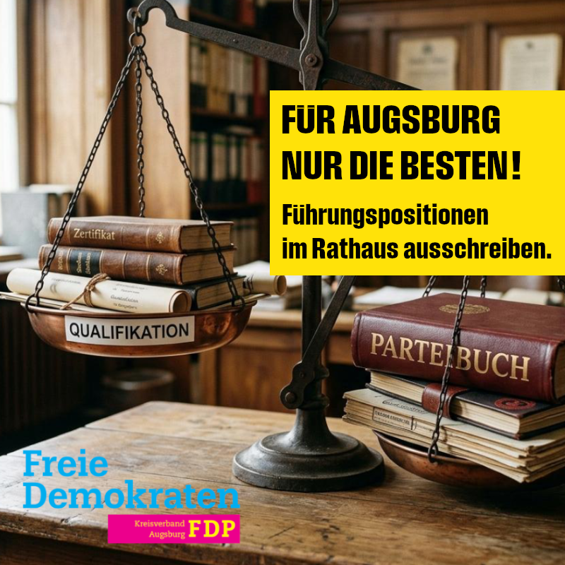 Die FDP Augsburg fordert ein transparentes und qualifikationsbasiertes Verfahren bei der Besetzung aller Leitungsstellen. Dazu gehören klar definierte Anforderungsprofile, nachvollziehbare Auswahlprozesse sowie eine frühzeitige Einbindung des Stadtrats. Eine klassische Ausschreibung sei hier die sauberste Lösung.