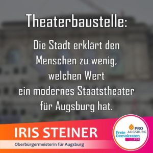 OB-Kandidatin Iris Steiner kritisiert die Kommunikationsstrategie der Stadtspitze: „Die Stadt reagiert immer nur auf Probleme, erklärt den Menschen aber nicht, welchen Wert ein modernes Staatstheater für Augsburg hat.“ Trotz starker Publikumszahlen und ausverkaufter Vorstellungen werde Intendant André Bücker kaum in die Kommunikation eingebunden. „Das Ensemble zeigt schon an den provisorischen Spielorten Spitzenleistungen. Mit ihm wird das sanierte Haus ein Publikumsmagnet werden und die Innenstadt beleben.“