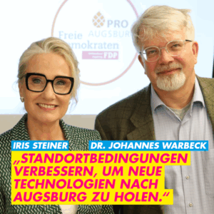 Die OB-Kandidatin von FDP/PRO AUGSBURG Iris Steiner betont, dass Augsburg vor allem dort handeln kann, wo kommunale Gestaltungskraft tatsächlich greift: „Die Stadt kann keine globalen Investitionsentscheidungen beeinflussen – aber sie kann lokale Standortbedingungen verbessern. Dazu gehören eine schnellere und digitale Verwaltung, eine aktive Wirtschaftsförderung mit klarer Innovationsstrategie und Kooperationen mit Hochschulen und Forschungseinrichtungen, um neue Technologien und Start-ups in die Region zu holen.“